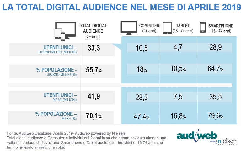 Audiweb, total digital audience di aprile: raggiunti 41,9 milioni di utenti unici